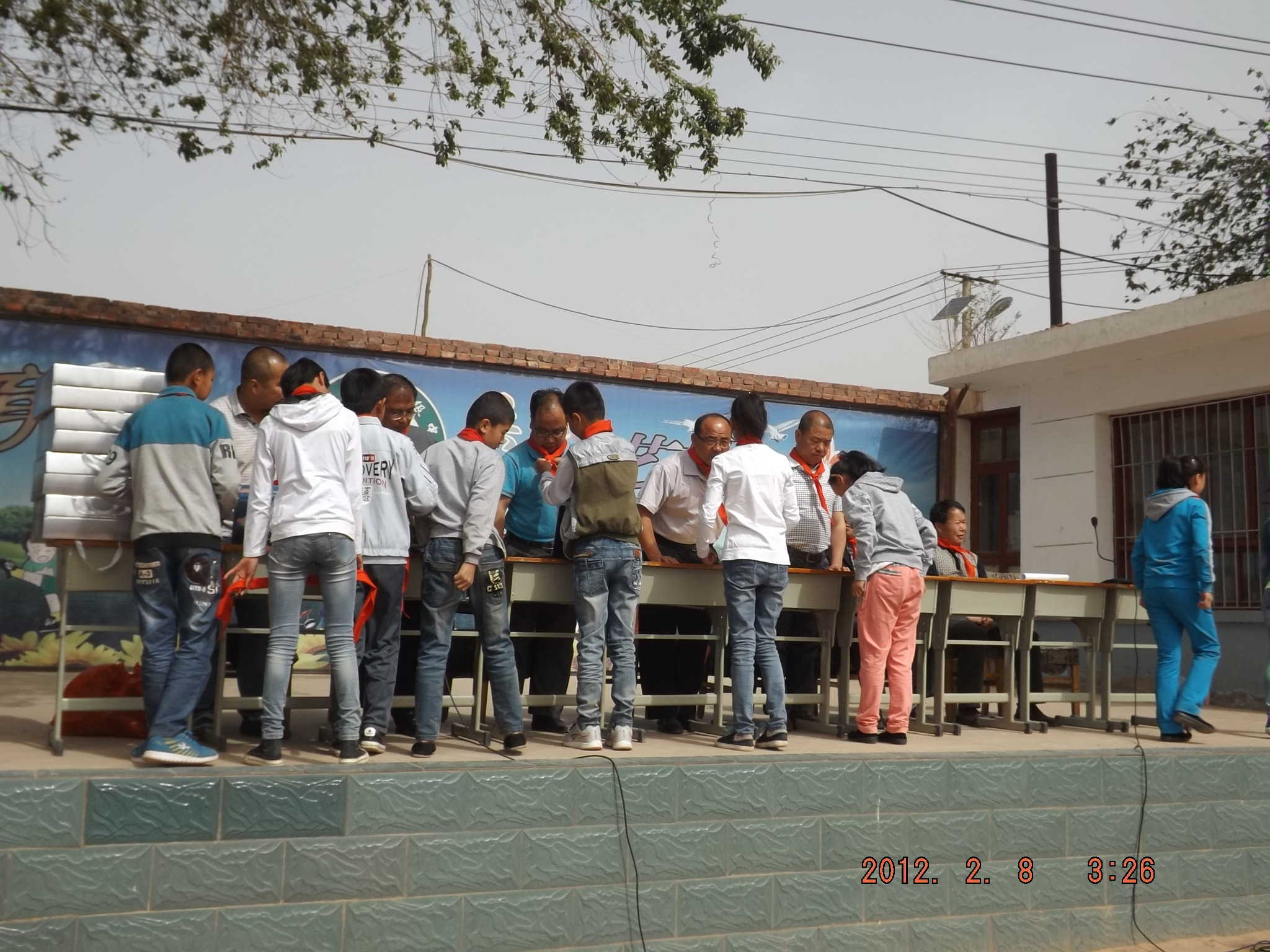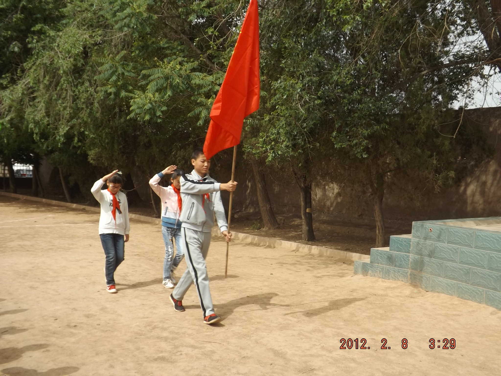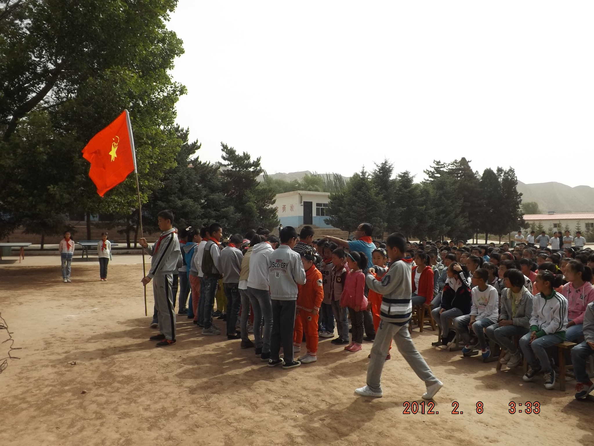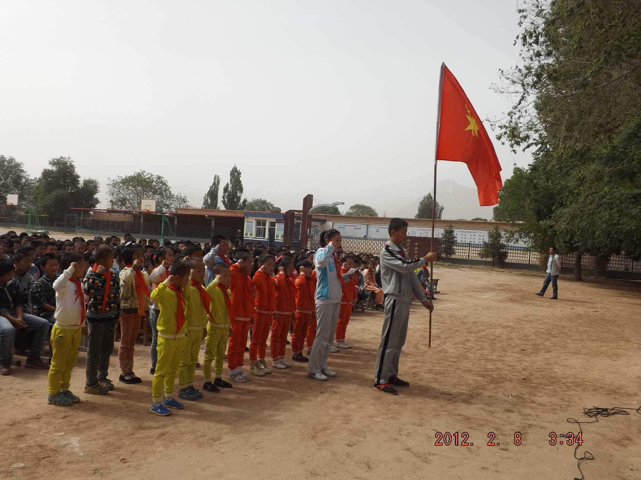 两个小学部的少先队员做护旗手,一个中学部的同学手举少先队旗进入了会场,然后学校的老师们就开始给新入队的小同学戴红领巾了。