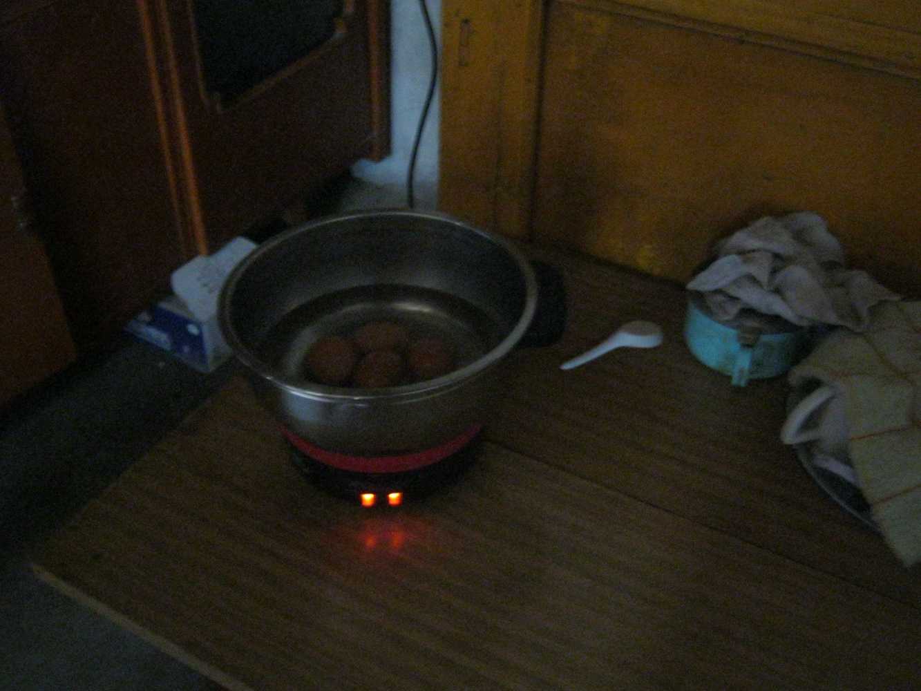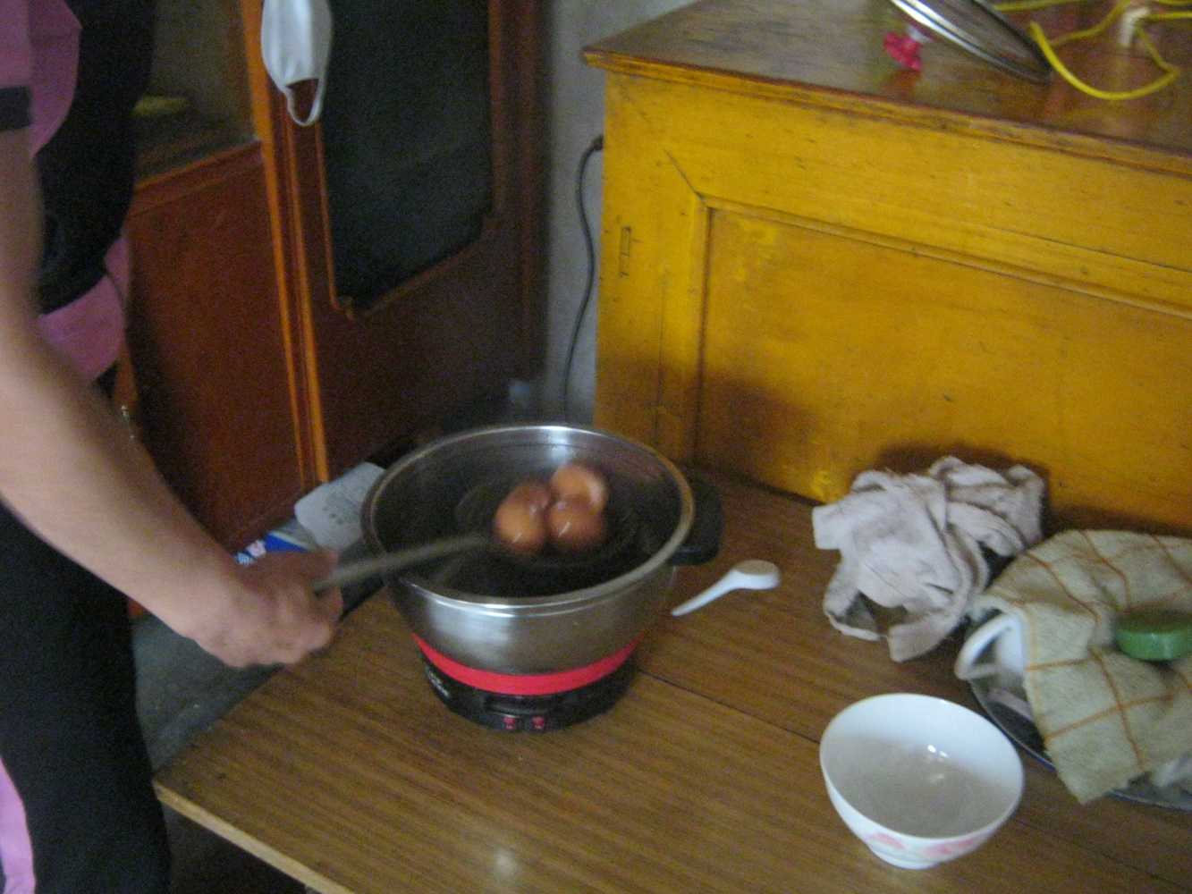 姑姑先拿出来电饭锅,再往锅中倒入适量的水,然后再往锅中放几个鸡蛋,接上电源,盖上锅盖,就开始煮了起来。我看着锅里的鸡蛋"扑通扑通"的样子,我有种说不出的感觉,好奇妙。就这样,煮了大概有二十分钟左右吧。姑姑就把鸡蛋从锅内捞了出来,让它凉了一会儿。