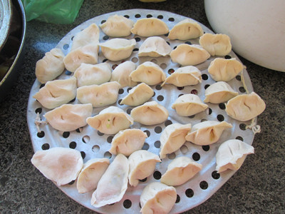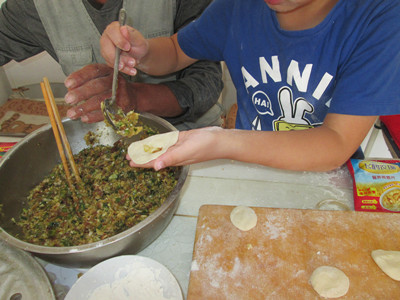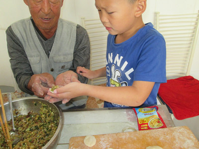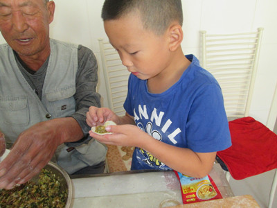 开始包饺子了。我先拿一张饺子皮,放在手上,拿筷子夹了许多馅,放在饺子皮上,学着爷爷的样子包起饺子来。