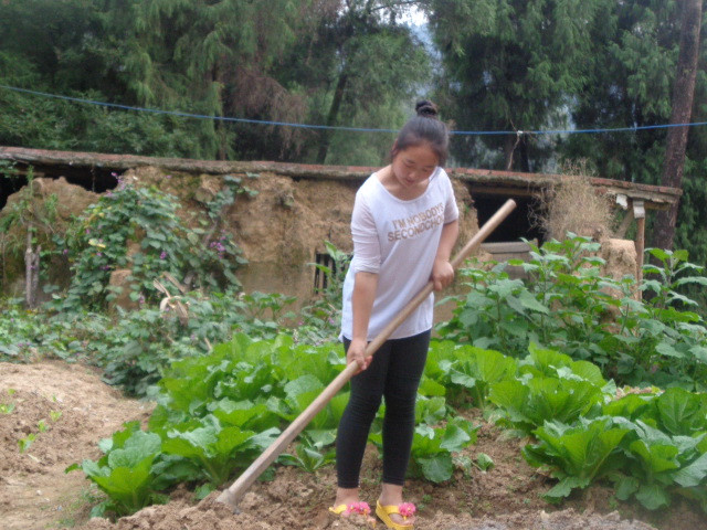 我们来到种豌豆的地里,姐姐把豌豆放在地上,用锄头先把地里的土给松一下,这是需要一定时间的,这是时姐姐已经满头大汗了,可是地才挖到一半。