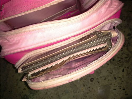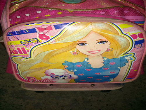 书包共三层,最外的一层上面有一个小女孩,小女孩的头发是黄色的,耳朵上面戴着心形的耳环,她的身边还有一只羊,羊的眼睛上戴着爱心眼镜,头上还有一个蝴蝶结。里面装有字典,词典和墨水。