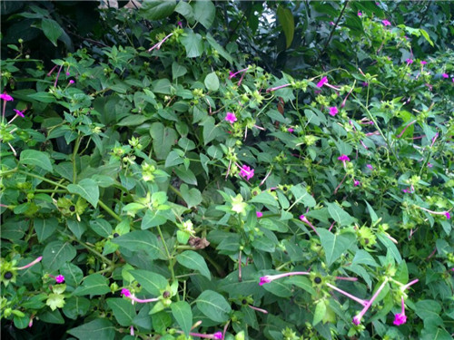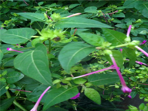 如果这时你把它的花朵连根摘下,再剥去外面的叶,就会看见一个绿色的小球,把它使劲一拉,就会拉出一根由白变紫红的丝来。这就是胭脂花的雄蕊,那个小球就是胭脂花的种子。深秋,种子变成了"地雷",也非常硬,黑黑的,有一道道裂痕。把它摘下来,放在地上,像一个个地雷,所以又叫"地雷花"。