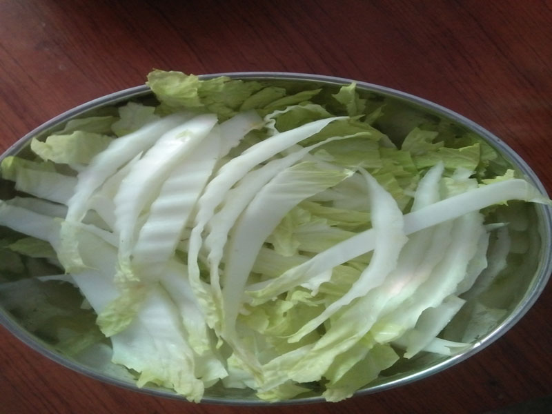 第二步:把白菜底部一片片的扯下来洗干净,放齐,切成细条,看起来像一个月亮弯弯一样。