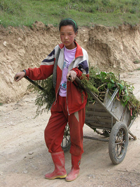 放学回家后便匆匆忙忙拉上架子车,来到地里,帮家里割草,准备回家喂牛。生活的重担已压在她稚嫩的肩膀上,面对贫穷的生活,写在脸上的只有惆怅和无奈,但生活还得继续!