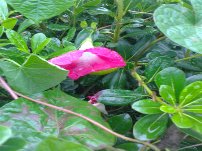 在淅淅的雨下后,一朵娇羞的粉脸露了出来。在雨水的洗礼下,它显得格外美丽,它是牵牛花,边儿坦开,中间凹起,是一把号令万物的角,使所有人都臣服于它。