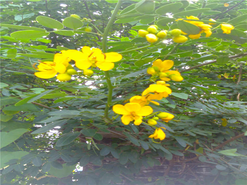 在房屋之间,生长着几株黄灿灿的鲜花。在灰沉沉的建筑中,它们显得格外亮眼。一株上有几棵芽,花蕾镶满了株枝,一朵朵花儿四周黄,中间红艳。而它们的小叶儿可以做指甲,美丽极了。