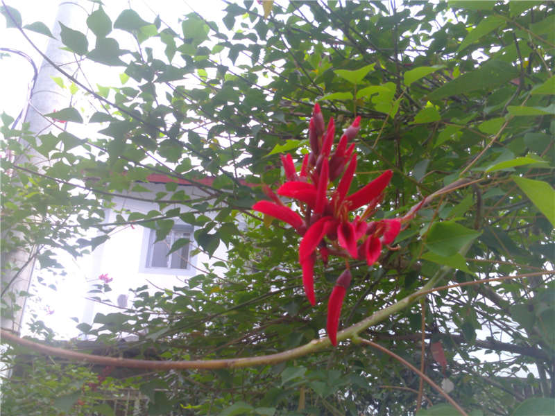 我不知道这是什么花儿,但它吸引我的眼球,以至于我迷恋上了它。一朵朵小花儿似一弯弯月牙儿,挂在枝头。红色是它的生命,是它的活力展现,显得格外的精神。