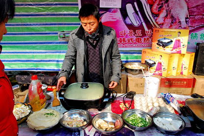 我们又走向下一家,你们看这位大叔在推销锅,他就讲的头头世道,把我们这些客人说的糊里糊涂他做生意也有一套喔........
