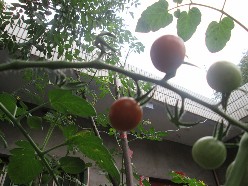 在天空下,那红色的番茄好像玛瑙般鲜红,那样的珍贵。但实际上,我的小番茄的却没有打农药,它是无公害食品,也算得上“珍贵”吧!