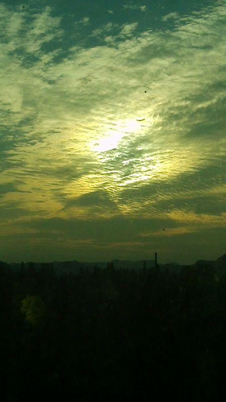天空中由到西,看吧,好漂亮啊!先是一片蓝色,慢慢的,不留痕迹的混进红色,融成一片不知名的色彩,最后终于变成了激越的红色。太阳周围的云层被绯红的光芒映衬着,变幻着色彩。终于晚霞把一切都镶嵌的金黄闪烁。