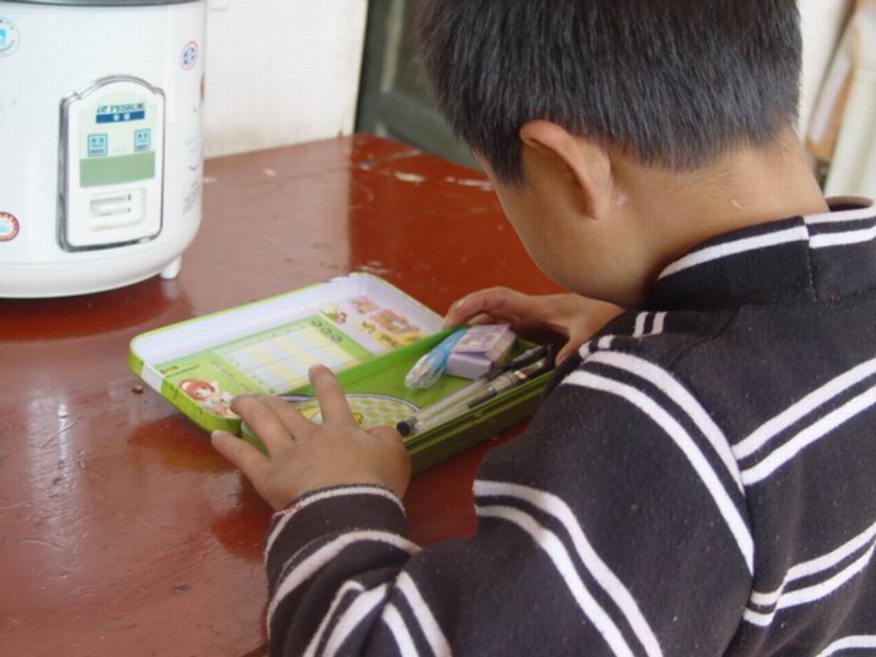 看!表弟来到我家,他一会儿望望这儿,一会儿望望那儿 ,最终选中了他的目标——我的铅笔盒。于是他跑到桌子跟前,打开了我的铅笔盒。他对里面的什么都爱不释手,拿起这个,望望那儿个。最后还不死心——他拿起盒子中的盖子,还要看看底层里有有什么好东西。