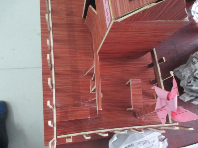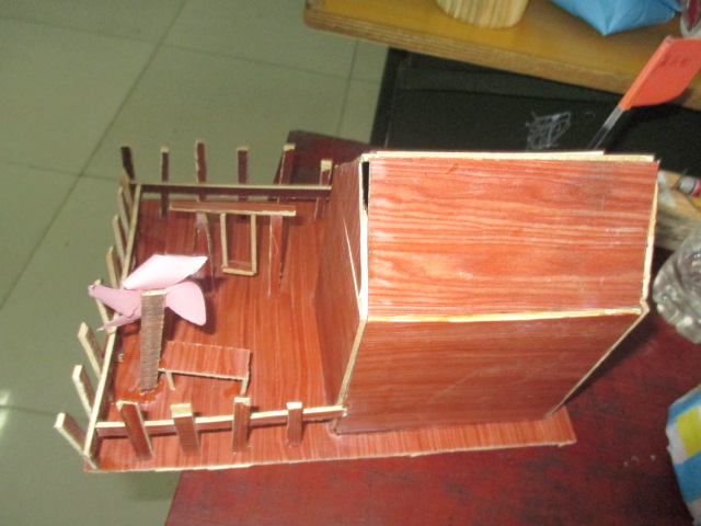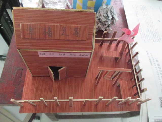 一回到家,我就陷入了沉思,想一下要做什么作品,过了一段时间,还是没有东西可做,突然想到,我们生活在农村,周为都是树,我可以做一个木雕啊!说干就干。我先去找了一块木头,从最基本的开始,我想做一个小景观,于是把木头砍成片状,不平就用砂纸打磨,不一会儿就光滑了,拼成房子,再找一些小草装饰一下,就行了!