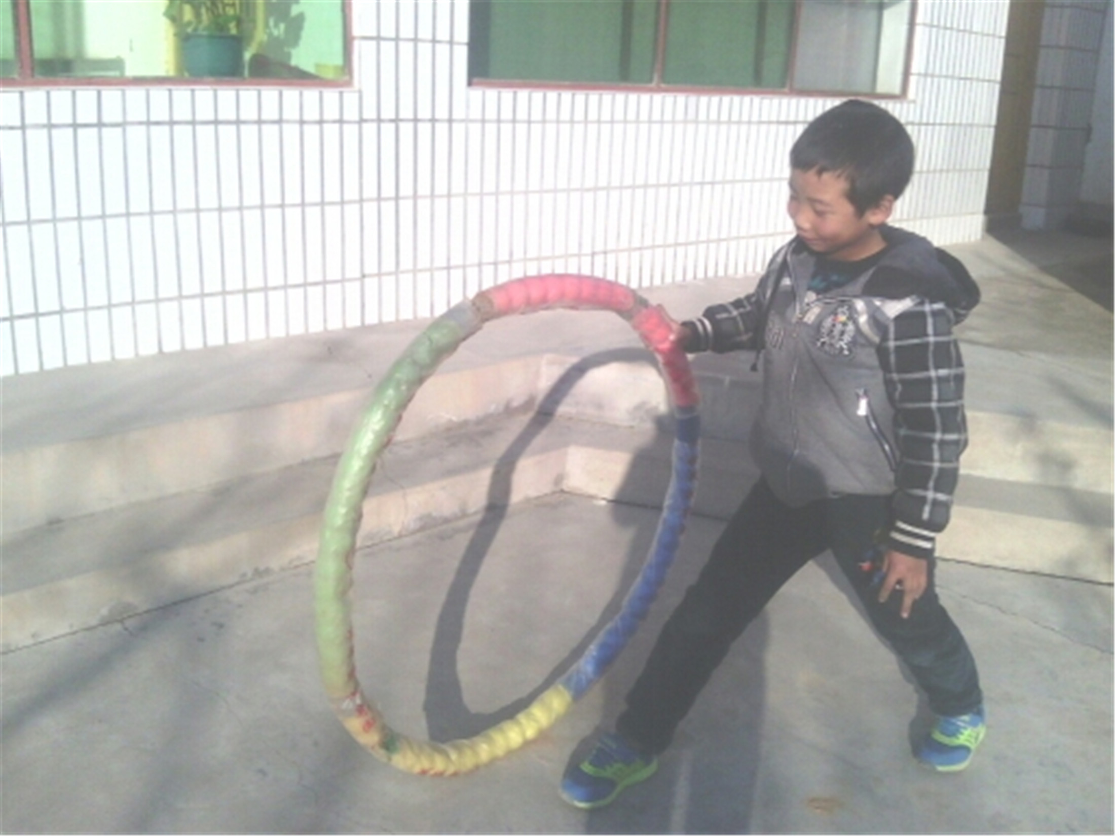 他玩起来那可一发不可收拾,他对呼啦圈颇有研究,什么玩法他都能想得出来。也许只有你想不到的,但是没有他做不到的。他可以把呼啦圈当飞镖扔,也可以把呼啦圈滚起来,当他把呼啦圈滚起来的时候,自己也会跟着呼啦圈跑。呼啦圈快要倒下的时候,他就一把抓住,不让它倒下。