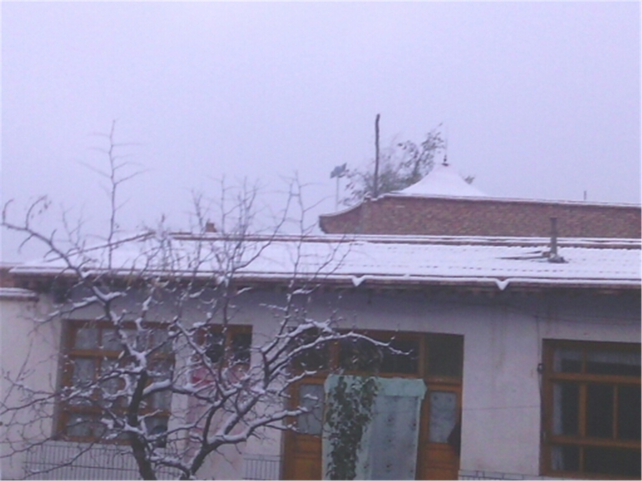 雪随处可见——屋顶上,树上,田地里,就连后面的小角楼也披上了白纱,枣树上的雪更是百年难得一见,光秃秃的树枝,虽是粗糙,但也很优美,只有一小部分是绿色的。我想,应该是枣树为的它遮风挡雨。人们都不想出来,难道他们不喜欢这么美丽的雪景吗?