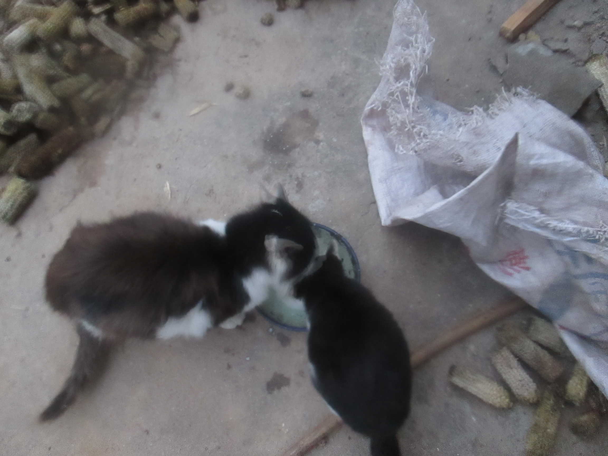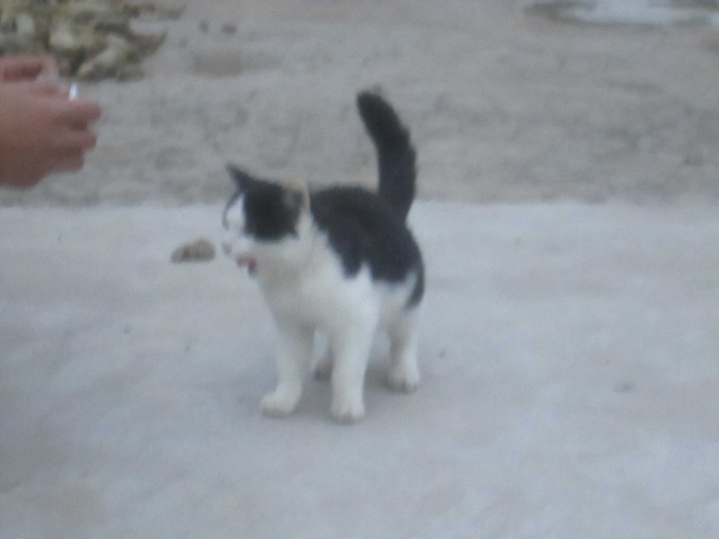 小猫自然要比妈妈乖巧一些。我用吃的去引诱它,它便很着急的跑了过来。我把食物向上一抬,它就会用两只后脚着地在那里够吃的。爪子放下的时候,它的尾巴还会高高的翘起来,只有你把食物给它放下,它才会把尾巴放下吃东西。