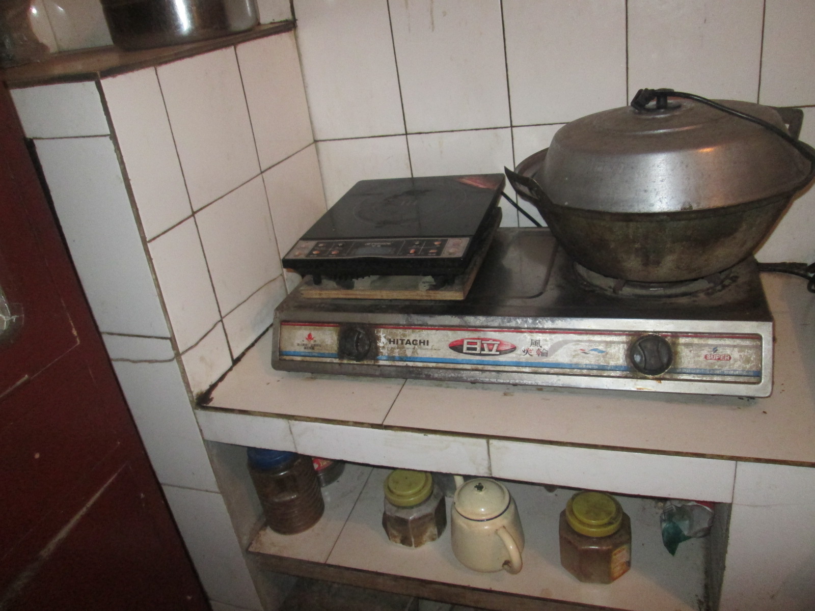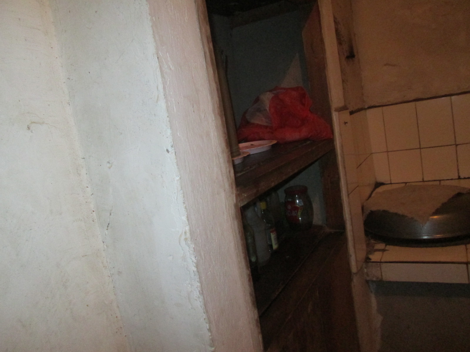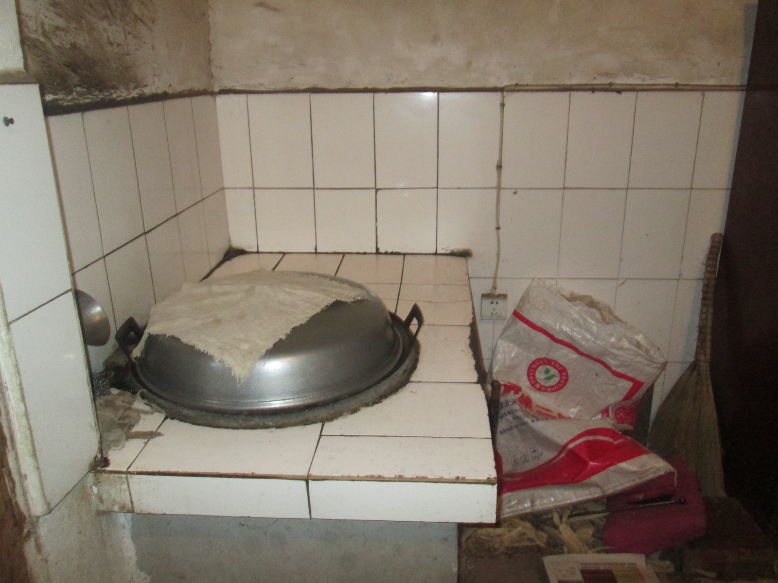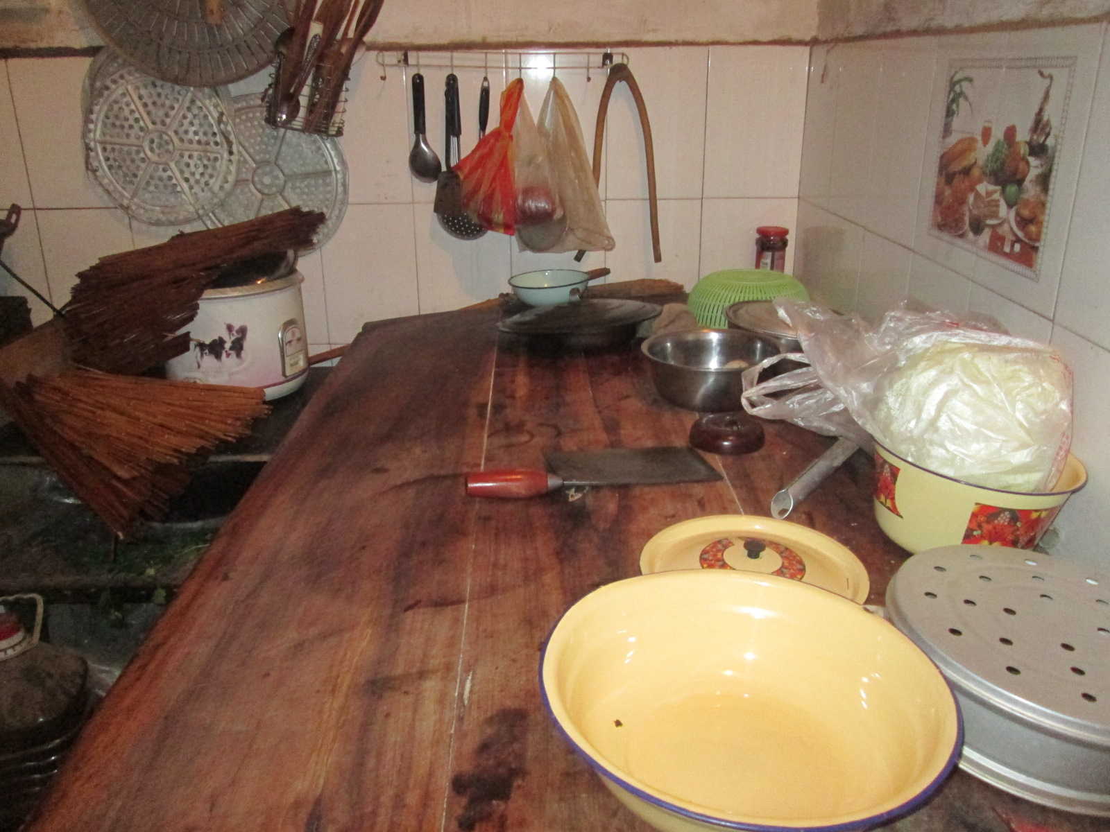 前方是一个大锅,是一个烧材火的锅,所以冬天总是爱往这儿钻。锅的旁边也有一个柜子,里面放着吃饭用的这一套东西。这就是我们家的厨房,也是非常整洁的厨房。