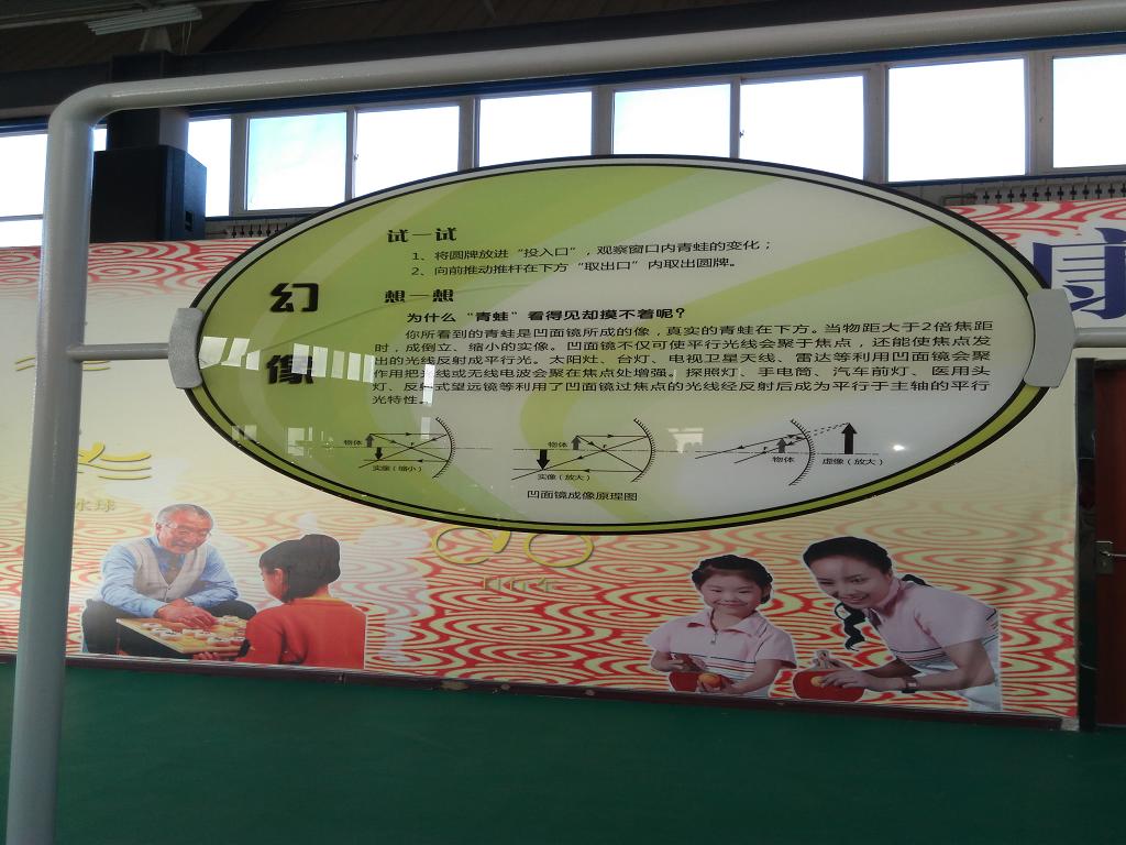 上周我们参观了科技宣传。来到科技馆,看到来参观的人特别多。这是幻像,挺有意思的。先把圆牌放在投入口,你所看到的物体是凹面镜所成的像,而真实的物体却在下方。