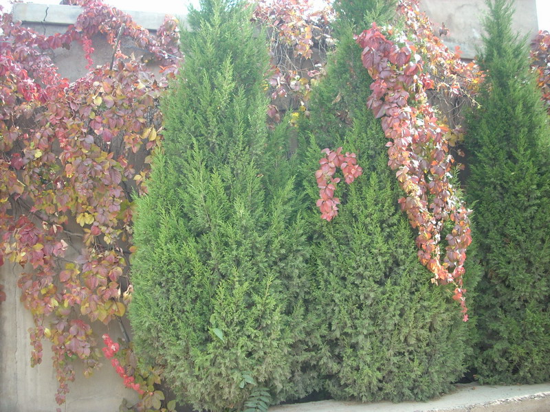 看,这是爬山虎。秋天的它换上了红色的外衣 ,使我不由得想起王维的那句诗"霜叶红于二月花",而如今应改成"秋日爬山虎,红胜于二月花"。它有时还给人一种火的热情。