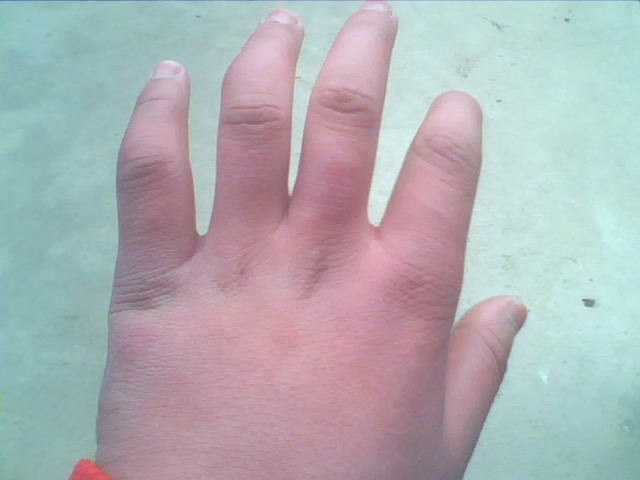 可似乎这"暴风雪"就快来了。两只手不时痒了起来,搞得我一节课都在挠,下课了,一研究,事实证明,"暴风雪"是真的来了,My God!刚才不是还没有吗,怎 先是左手的食指有点痒,不一会儿,变成又红又肿的了,紧接着是左手的无名指,小指它们也都变成又红又肿的了,原来是"冻疮总动员"啊!