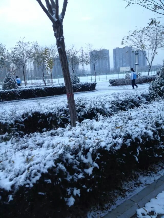 站在高处放眼望去,这个城市都是白色的,路上的行人若隐若现,只能看见马路上的小汽车在小心翼翼的穿梭着。树上的树叶还是红色的,上面又覆盖了一层白色的薄雪,浅浅的白色中透露出一丝淡红,非常美丽。高大的建筑上覆盖了白雪后更像是一位庄重肃严的老人,矗立在城市的中央,守护者这座城,走过了多少个风风雨雨,到今天依旧那么和蔼可亲!