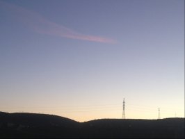 远处的山坳泛着微恙的红晕,略带羞涩的依偎在天空,淡蓝清新的上空飘逸着一抹淡红的丝带,娇嗔的独自享受着这无与竞争的盛宠。山坳上的电线塔静默的守卫者孤独的安宁,恪尽职守着自己的本分。