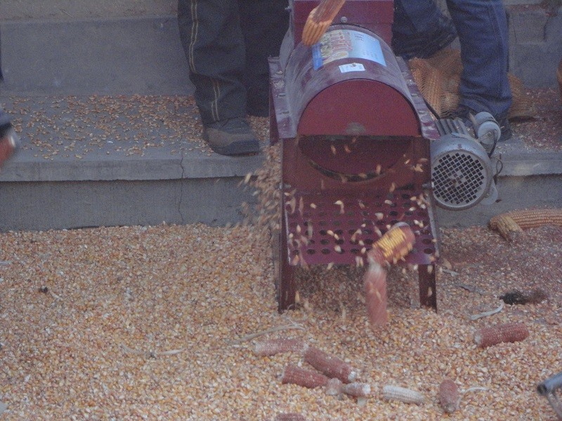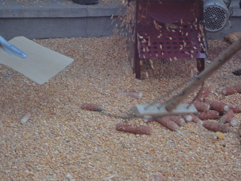 只见大叔和舅爷将一袋苞米棒子倒进机器的进料口,随着一噼哩啪啦的声音,玉米粒和玉米棒妈妈分离了,各自从机器的另一端飞速的跑出来了,妈妈忙着收拾空棒子,一边将没有脱尽的棒子挑出来,有些顾不过来了,我的任务是把脱好玉米粒推到院子的另一边,摊开并不断的翻动晾晒。