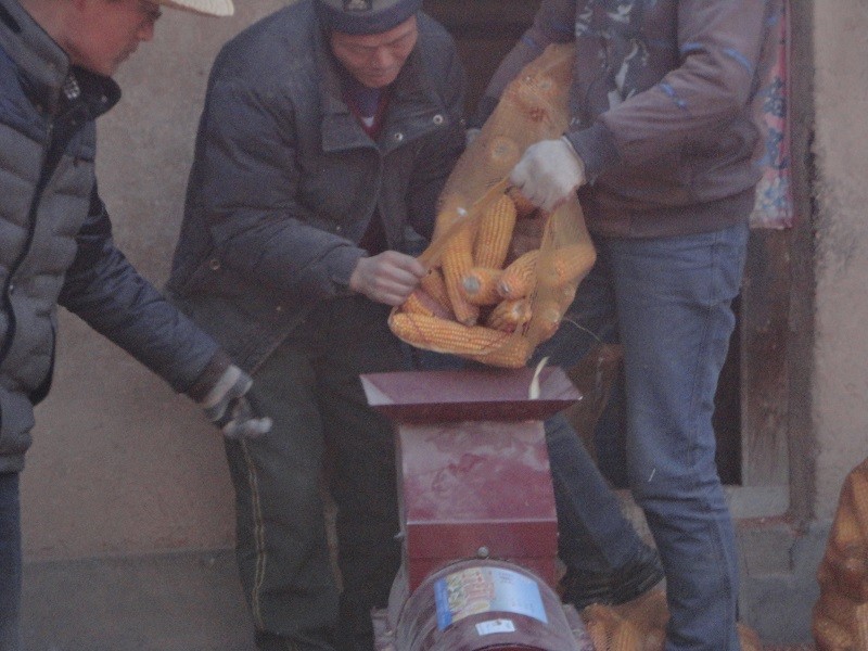 机器的轰鸣声、人们的欢笑声鸡杂在一起,校园一下热闹起来,冬日的寒冷也被劳动的热情场面驱走了。紧张的工作持续了一个小时,终于可以休息吃点东西了。 望着满院黄灿灿的玉米,大家都很开心——今年玉米丰收了,又有了托玉米的专用机器,不用用手一个一个的掰了,想想往年的辛苦,今天这活太轻松了。