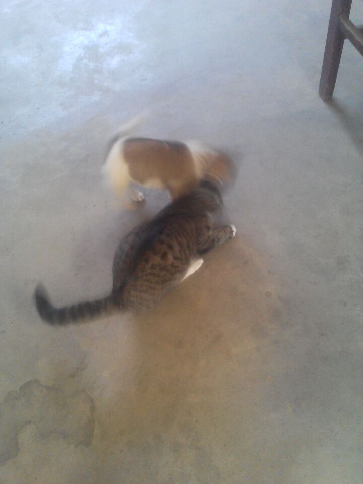 豆豆非常活泼,每次闲暇的时候,它都会把猫咬来咬去,总是玩个不停,有时我会把它叫个淘气鬼,我叫一声它就会跑来向我叫几声,好像再向我问好。