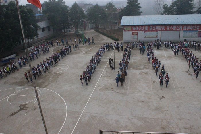 “团团转”。大课间的第一个内容就是跑步。每个班跑的步伐都非常整齐,从高处看就如一朵冉冉开放的鲜花。同学们都在操场上顶着寒冬的风霜,斗志昂扬的“团团转”增加身体的热量。