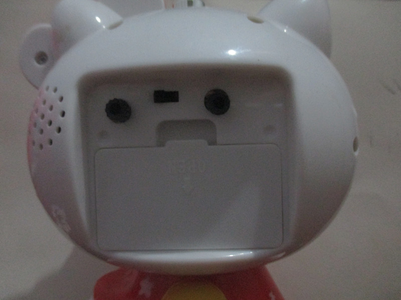 看了它的说明书,它的使用方法非常简单方便。在它的两只耳朵中间,有一个闹铃总开关,打开这个开关到指定的时间,闹铃就会响起。它有好多美妙的铃声可供选择,我选了一个我爱听的铃声,做叫我起床的声音。