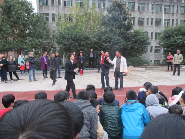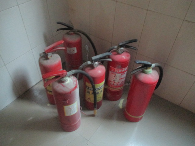 我们一般使用的是干粉灭火器,它喷出来的是白色粉末。老师正在给我们讲解使用方法。现在的灭火器都是干粉了,它可以对固体、液体、气体等发生的火灾进行扑灭。灭火器上有一个圆形的压力指示表,里面有红黄绿三色,绿色代表可以正常使用,黄色代表气压过高,红色代表气压过低,过高过低都不能使用……..
