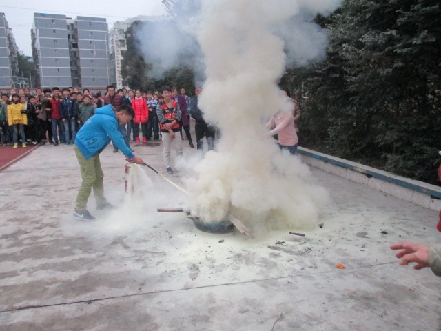 讲完之后,老师就在一盆熊熊燃烧的大火上进行灭火。只见一股白色的气体喷出,不到2秒钟,大火就熄灭了,旁边还有刺鼻的味道。然后老师要我们同学来实际使用,首先是男同学,然后是我们女同学,还有许多同学想去操作,由于没有那么多灭火器,很多同学都很失望。