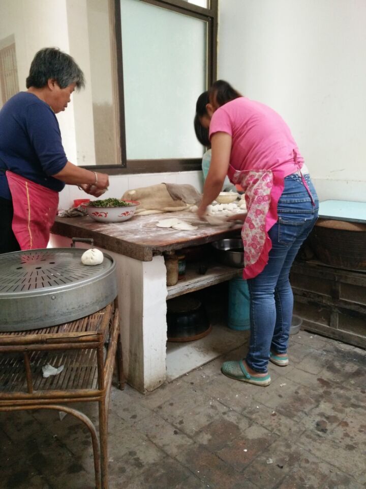 开始包包子了,先把长条面团扮成一块儿一块儿的,接着拿起一小块面团放在手掌中央揿了几揿,把它揿成饼形,在上面放一些肉馅,然后捏在一起。一个完整的包子就成型了。
