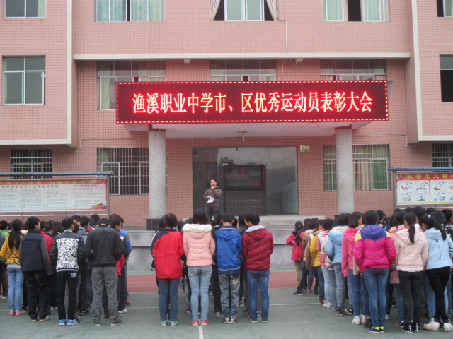 站在集合的位置上,上面显示屏出现了"渔溪职业中学市、区优秀运动员表彰大会"红色的大字。哦,我们明白了,这时学校又要表扬获奖的同学。学校领导在上面给我们介绍这次学校几个学生参加市区运动员的情况。说着说着就说到我们学习上来了,要求我们学习也要像这些获奖同学一样,努力拼搏,不怕吃苦,争取有优异的成绩为学校争光。