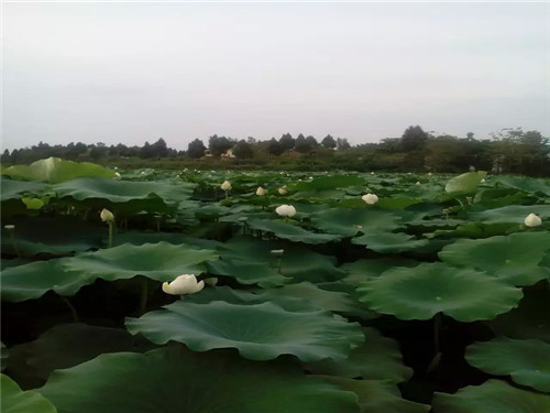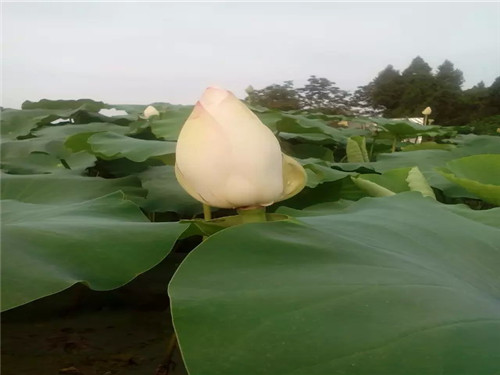 水池里的荷叶有的像一把伞,有的还是个"月牙儿"。雪白的花有的只开出一点点,有的花瓣全部展开了,有的还是花骨朵儿。荷花荷叶挨挨挤挤,像一个大家庭相互簇拥在一起。