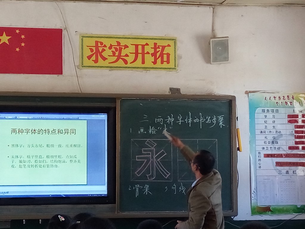老师先示范黑体字的写法,接着老师示范了宋体字的写法,老师写得课真漂亮,我不由得心生敬佩之情。我们按老师的要求进行练习,我也学老师的样子来写,可是就是写不好,老师看见了,给我进行了指点,我顿时信心倍增,终于写出了一个还算不错的黑体"永"字。