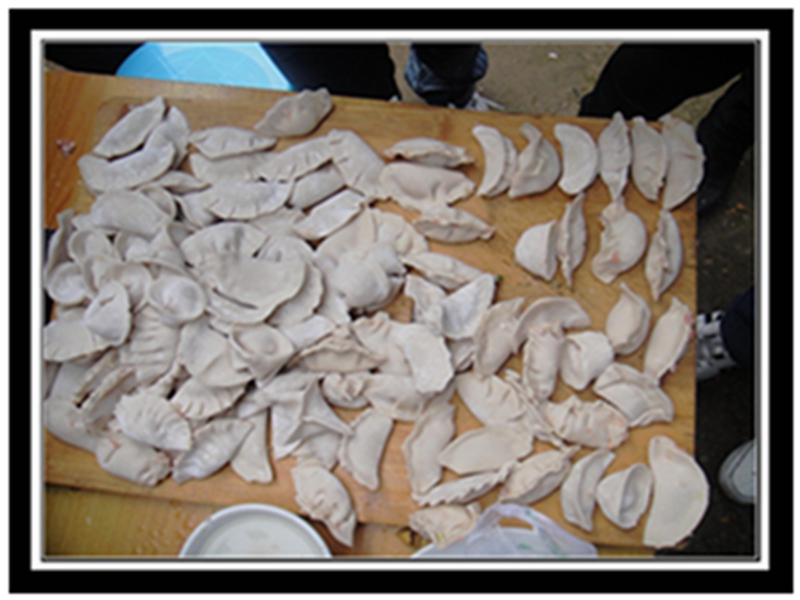 下午,全家人忙着在厨房包饺子。看着爸爸和馅:它把肉剁成比肉丝还小的颗粒,把韭菜和葱切碎放在肉里,又在肉里放盐、味精、酱油、香油。好香呀!妈妈和面。忙活了好一阵子,东西才算准备齐了。