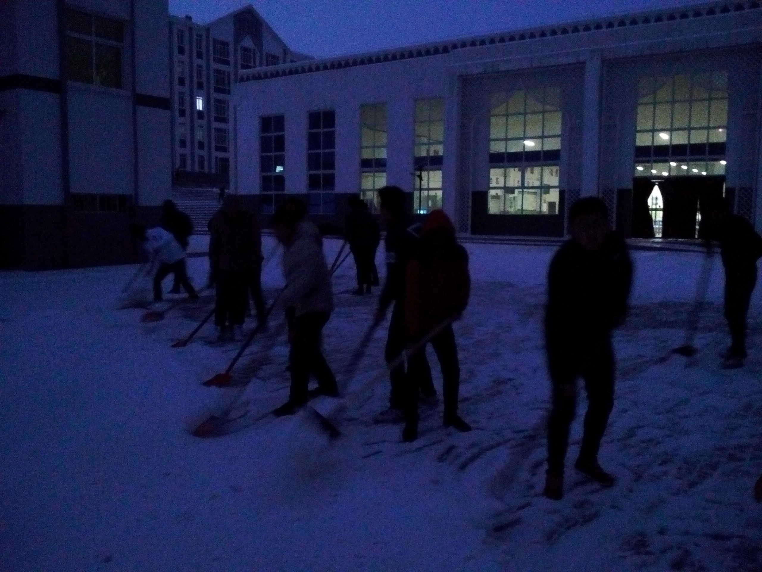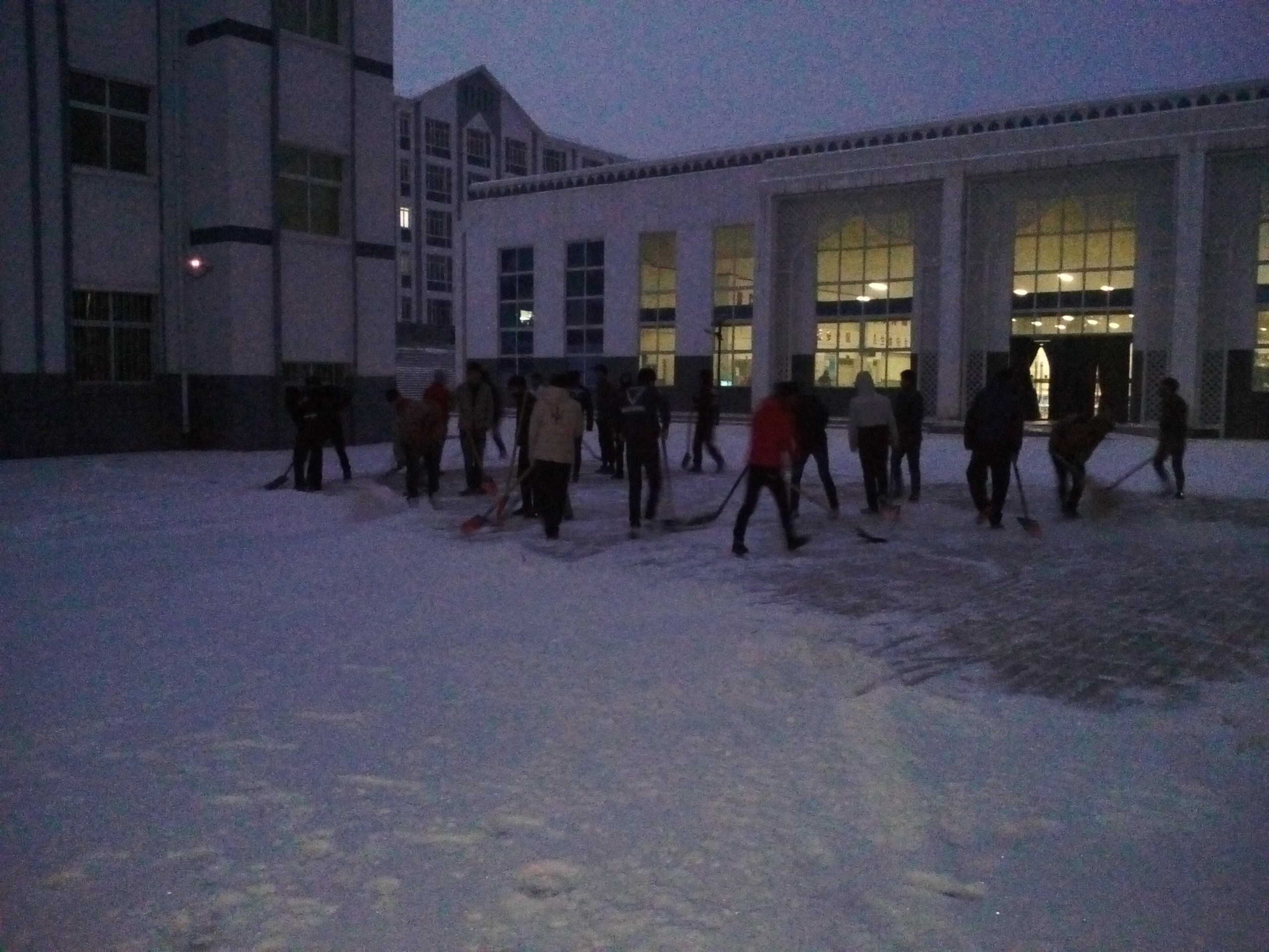 在西北地区来看,这样的雪很是平常。铺天盖地,银装素裹。它为大自然添了一件新装。 自从今天,大雪飘临,我们的生活就被打乱了。到今天,更是"忽如一夜春风来,千树万树梨花开"。学校积雪大概一尽多深了,浅处也低不过40毫米,这严重扰乱了我们的日常学习生活。于是,校领导决定组织今天中午铲雪。