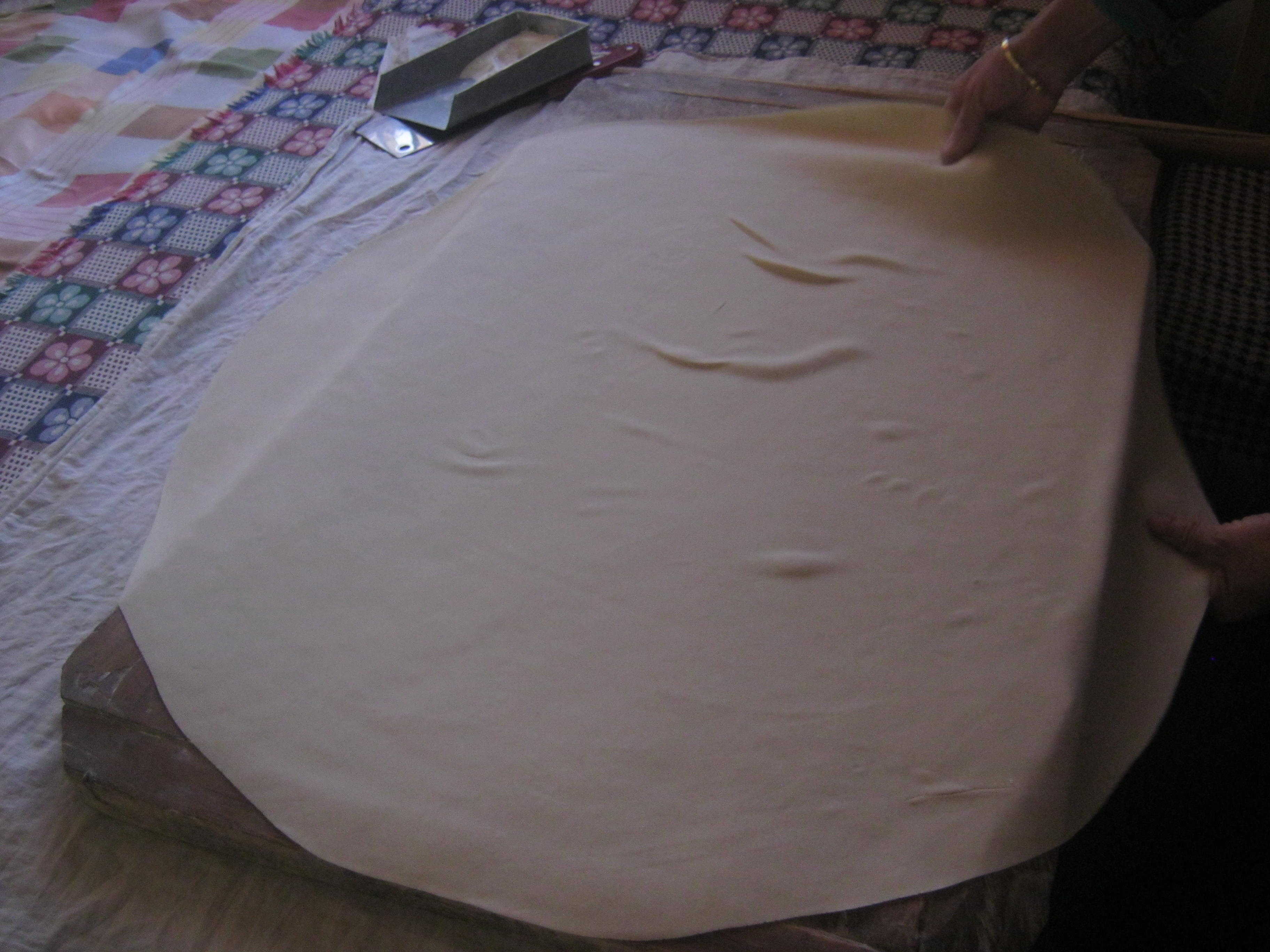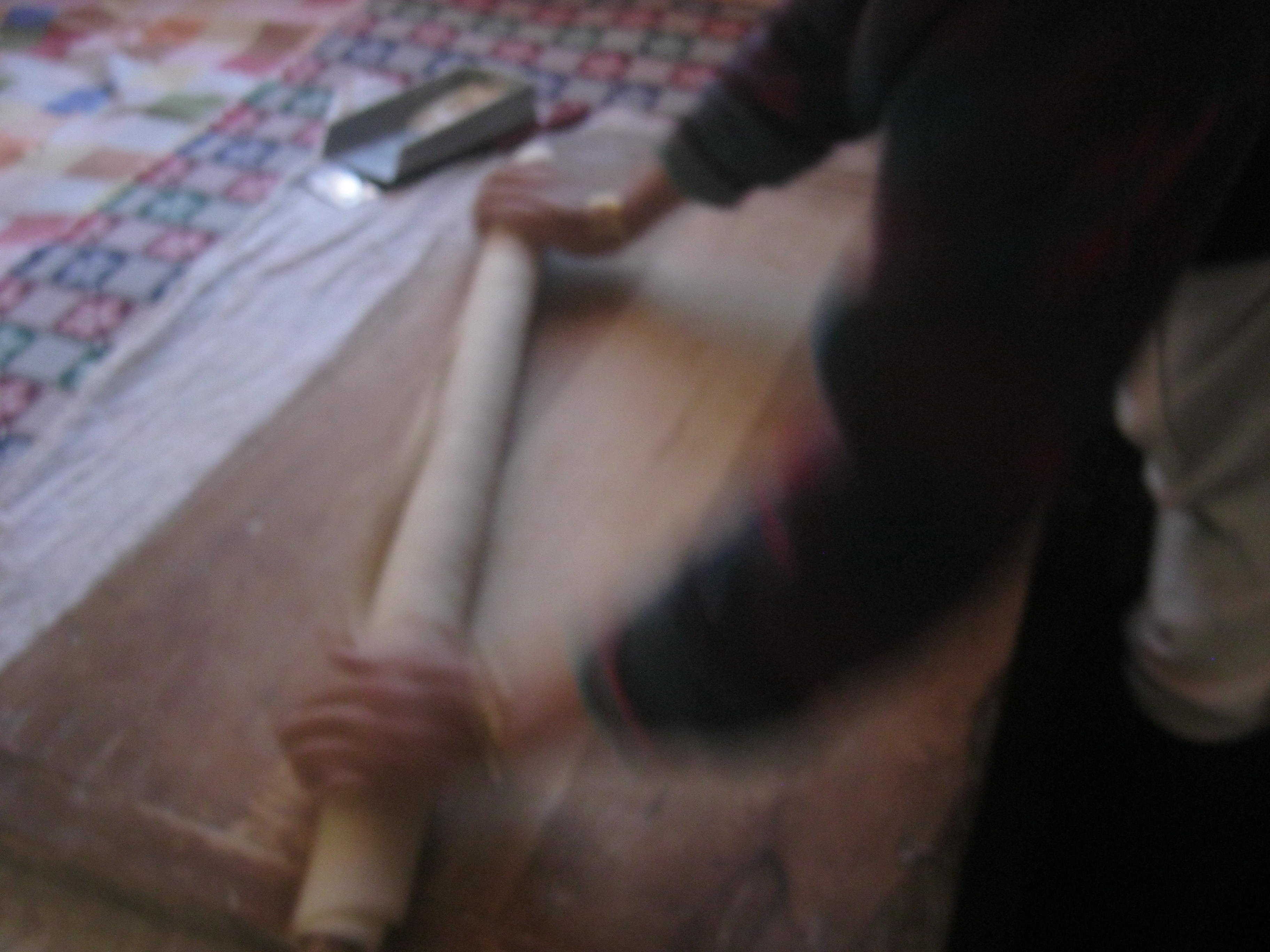 把面揉成一个圆形,接下来就是擀面了。擀的时候也要有规律,把它分成八个角去依次依次的擀,这样擀出来的面型是圆形的,而且面饼也比较均匀。一遍又一遍的擀,最后面饼被擀成薄薄的才成了。 接下来就是依次把它叠起来,大约五厘米左右的宽度。然后就切成细细的面条,把它们放成一把一把的,这样方便捞面。放面的地面撒上些干面,不然时间一长它们就互相粘在一块了。
