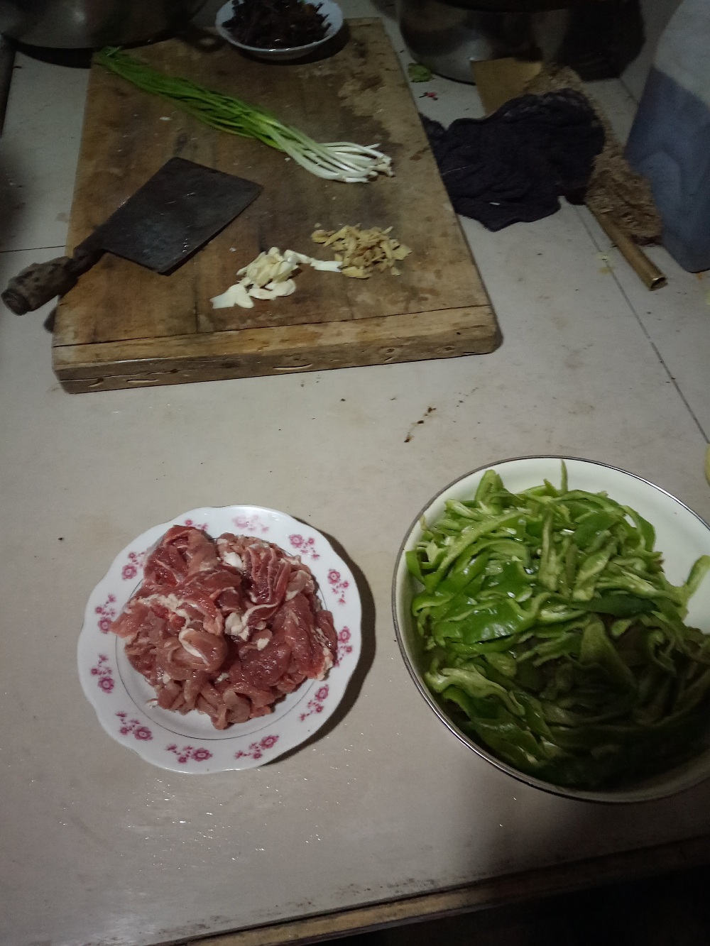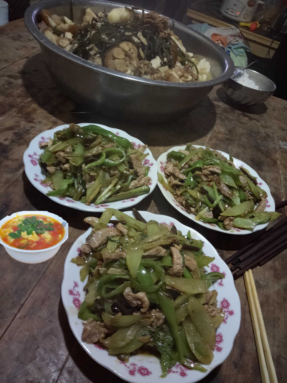 第一道菜,辣椒炒肉。烧红锅,再倒少许菜油在锅里,油烧热后将切好的肉丝倒入,不断翻炒,待肉丝变色了,基本就炒好了,再加入适量的盐和酱油,使它的色泽和味道更加诱人,再翻炒几下,装在盘子备用,又乘势倒入辣椒丝,一边翻炒,一边又放入各种调料,待均匀熟后再倒入炒好的肉丝,翻炒几下就可装盘了。 第二道菜,西红柿鸡蛋汤。在锅里盛上半锅水,烧开后,放入备好的西红柿,等水再次开后,再沿锅边缓慢倒入搅匀的鸡蛋,不要立即用筷子去搅,以免鸡蛋散开,不成块,等到西红柿和鸡蛋变色快熟的时候,加入芡汁,盐,鸡精,胡椒粉等各种调料,搅匀就可装盆食用了。