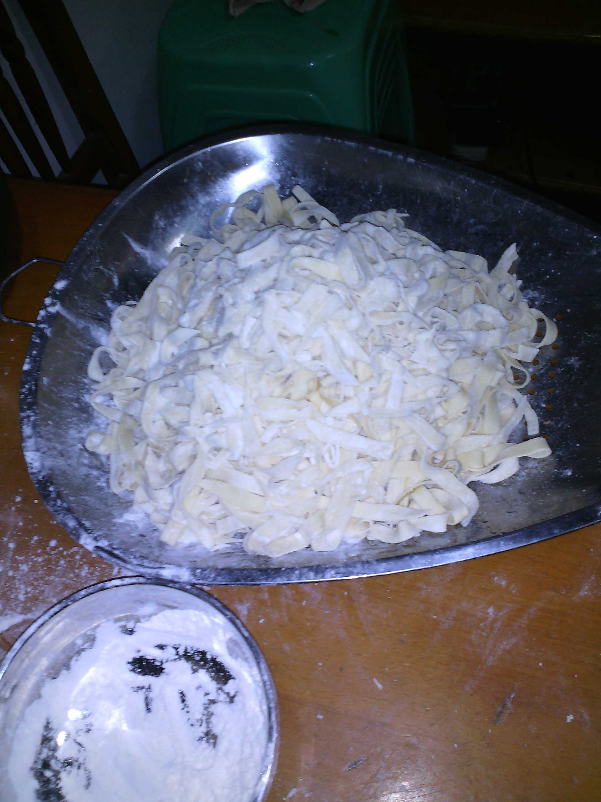 爸爸按照说明书组装起了机器,取出了白白的面粉,加入了适量的水,搅拌成干湿合适能捏成块的面团,调整面条机的刀口在较宽的位置,开始了把面团碾压成面皮的过程,经过一番辛苦的努力,我们终于把面团全部压成了面皮。然后又调整面条机的刀口在较薄的位置,将较厚的面皮再压成较薄的面皮,最后,再把薄面皮放到成型的刀上,做成了我想吃的宽面条和爸爸爱吃的韭菜面条,看着粗细一致的面条从机器上逐渐地出来,我们都露出了喜悦的笑容。