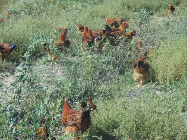 枸杞鸡们成群结队地觅食了。这里啄啄,那里刨刨,一会儿又听见鸡儿"咯咯"地叫着,在呼唤着它们的同伴一起来享受美餐。