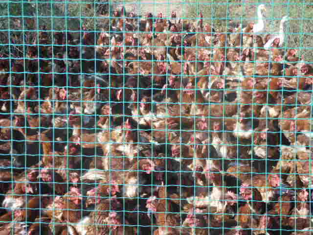 枸杞鸡用铁丝网围起来,防止鸡儿钻出去,也防止有人悄悄地把它们拿走。母鸡们用短短的两只腿支撑着肥大的身体,淡黄色的羽毛整齐地披在身上,一对对橘黄色机灵的眼睛滴溜溜的乱瞅着。
