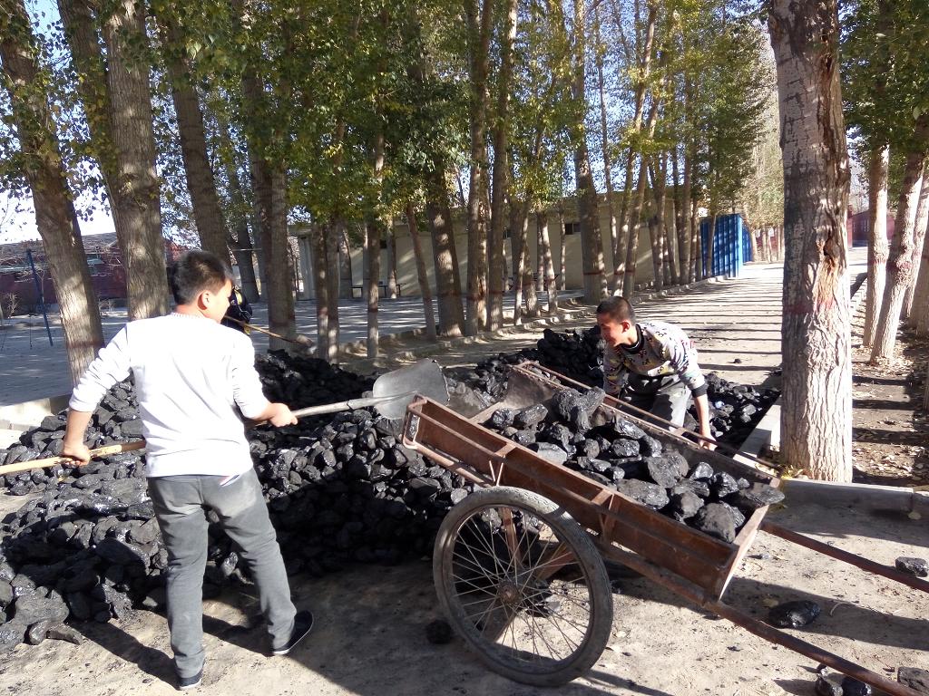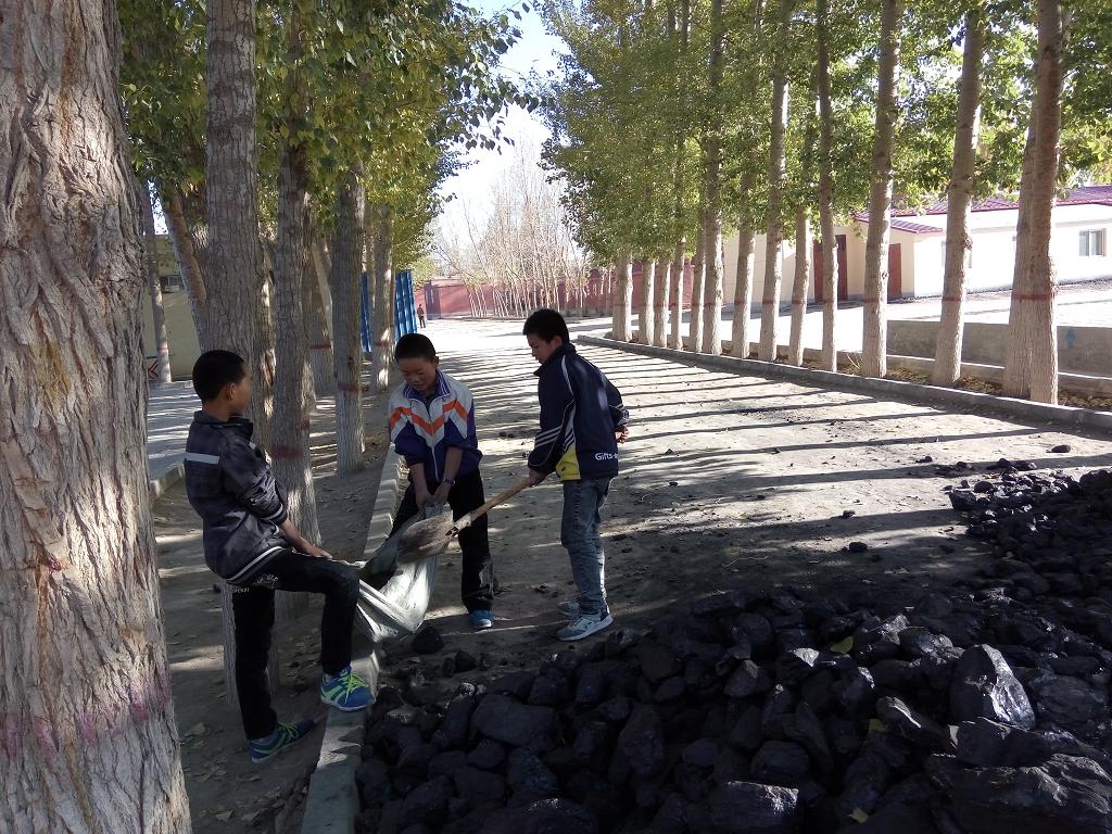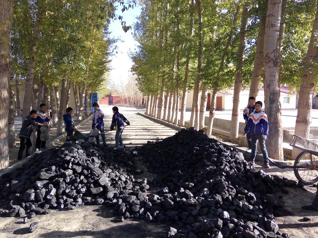 我们的劳动任务是分煤。虽然有点脏,但同学们还是愉快地接受了任务。班长把任务分解到各小组后,同学们更争先恐后地干了起来。有的用铁锹铲,有的用车子拉,干得是热火朝天。