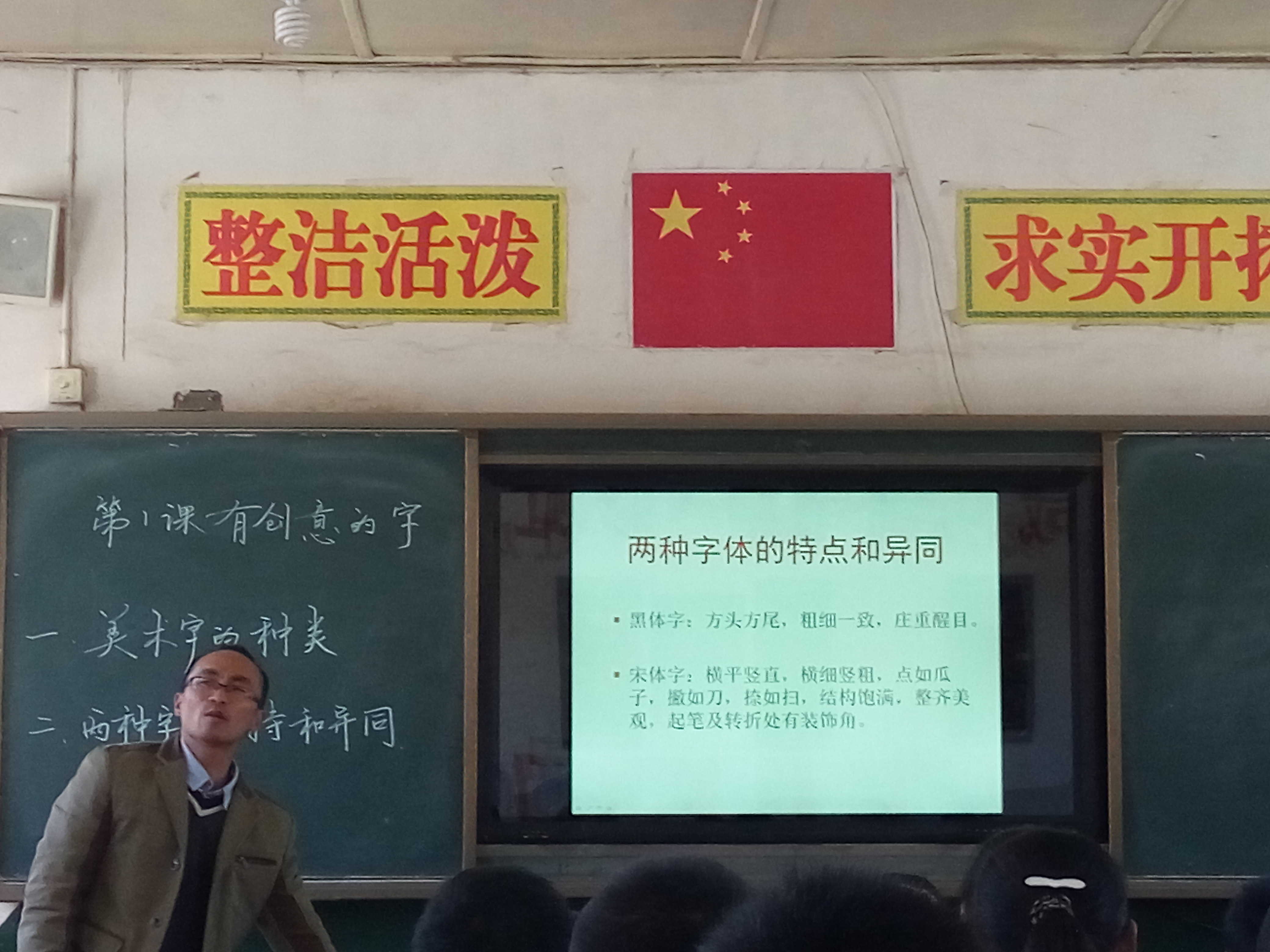 今天的内容是:有创意的字。王老师先给我们讲述了美术字的种类,然后又讲述了两种字体的特点和异同。同学们都很感兴趣,也听得都很认真。