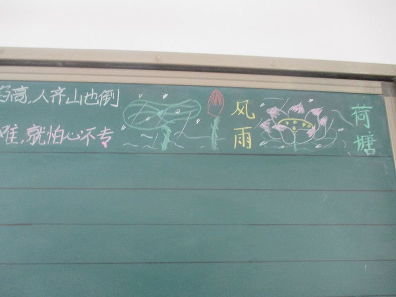 走进八一班的教室,映入眼帘的是小组展示用的黑板。黑板按照一定的规格画着十二条黑线。最上方分别是一个小组的组名及其布置,首先我们来,看一看"风雨荷塘"组,美丽的荷花盛开在池中,旁边还有一片大荷叶亭亭净植,几滴雨斜洒荷塘,显出几分韵味。