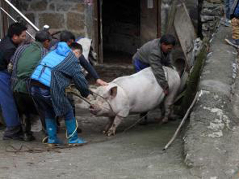 我们吃过早饭爷爷就出门了,不一会儿我家就来了好几个邻居,后来才知道这几个叔叔是来帮忙的,不久我就听见有猪再叫,我打开门一看才知道是爷爷他们在把小猪往外面赶,小猪可能知道自己要被杀了,所以自己拼命的想要挣脱。不过小猪在怎么挣扎也还是逃不了杀猪人的手中。