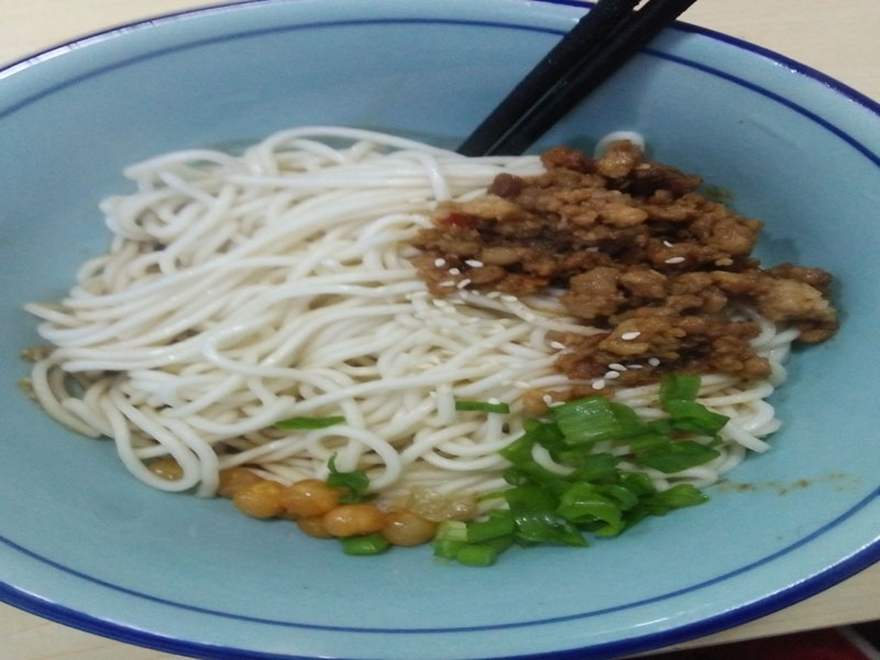 炸酱面是我们这里的一种美食,就是在一碗面上放上一堆炸酱,一边放入青菜、葱花、芝麻。