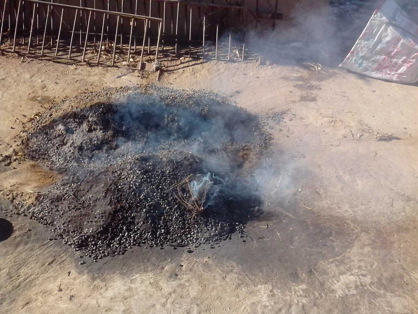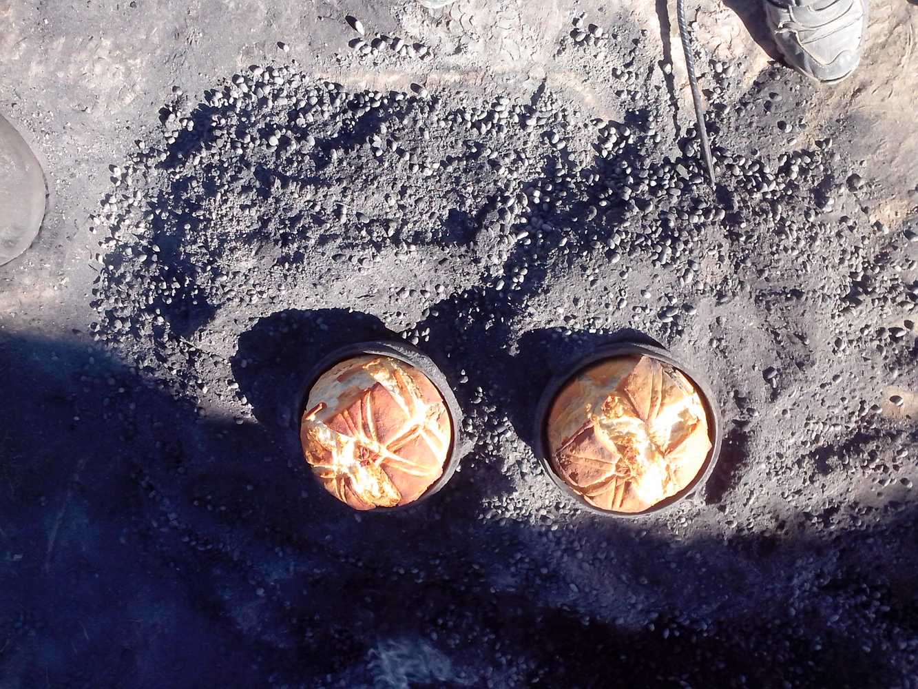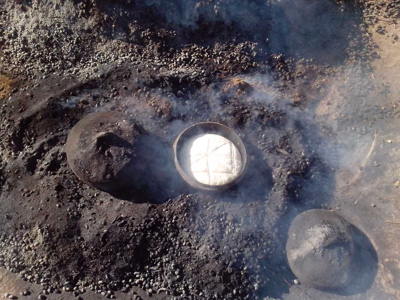 然后,把做好的馍馍放入铁制成的烤锅内,埋在已燃烧的土堆中,然后等一个小时,馍馍就熟了。烤熟的馍馍成金黄色的,散发着诱人的香气。