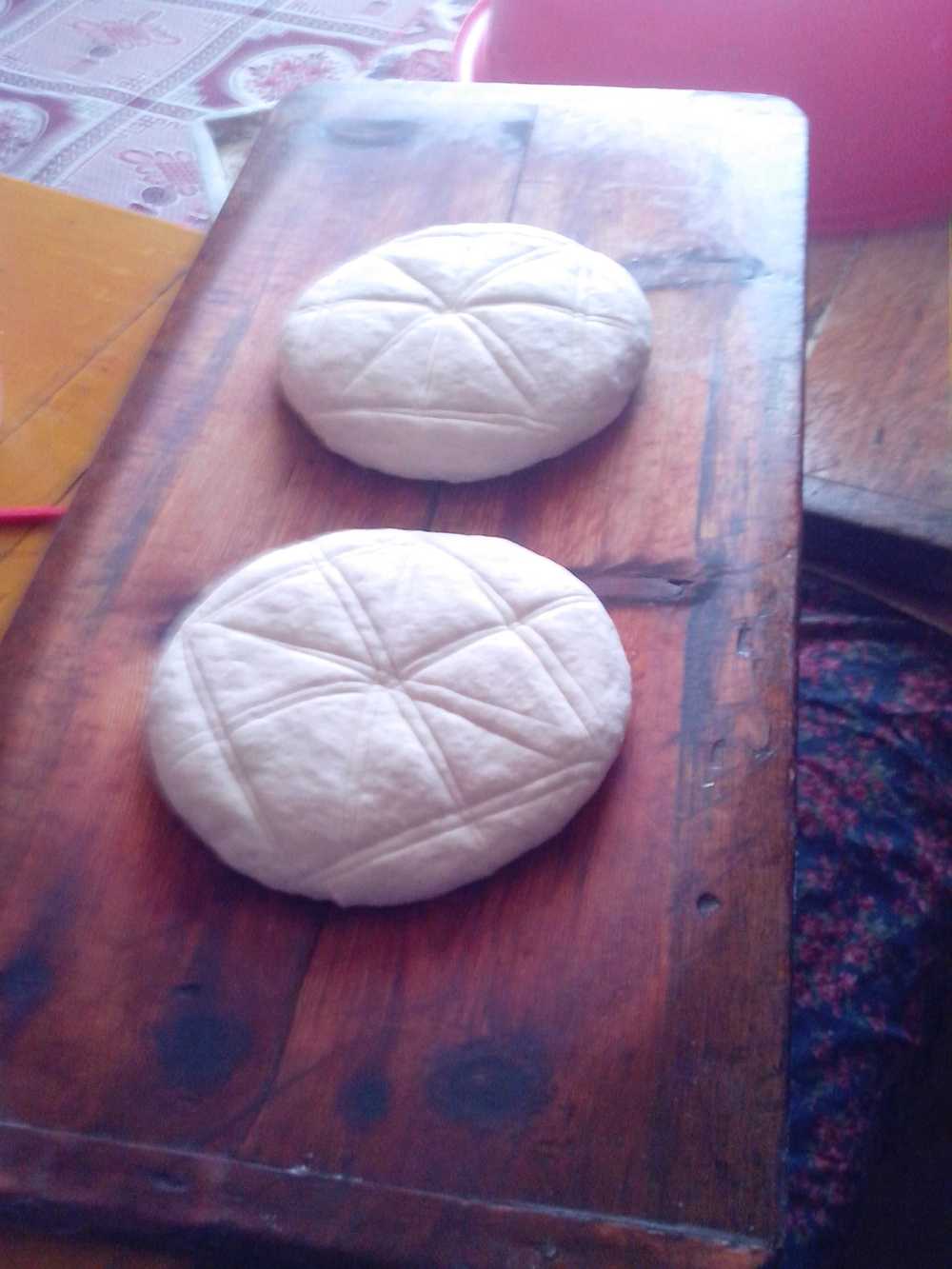 等面揉好后,妈妈把面分成几个小面团,接着把它们揉成小圆饼,再在它们上面用刀轻轻的切几道刀痕形成美丽的图案,好让它们透气,熟得快一些。